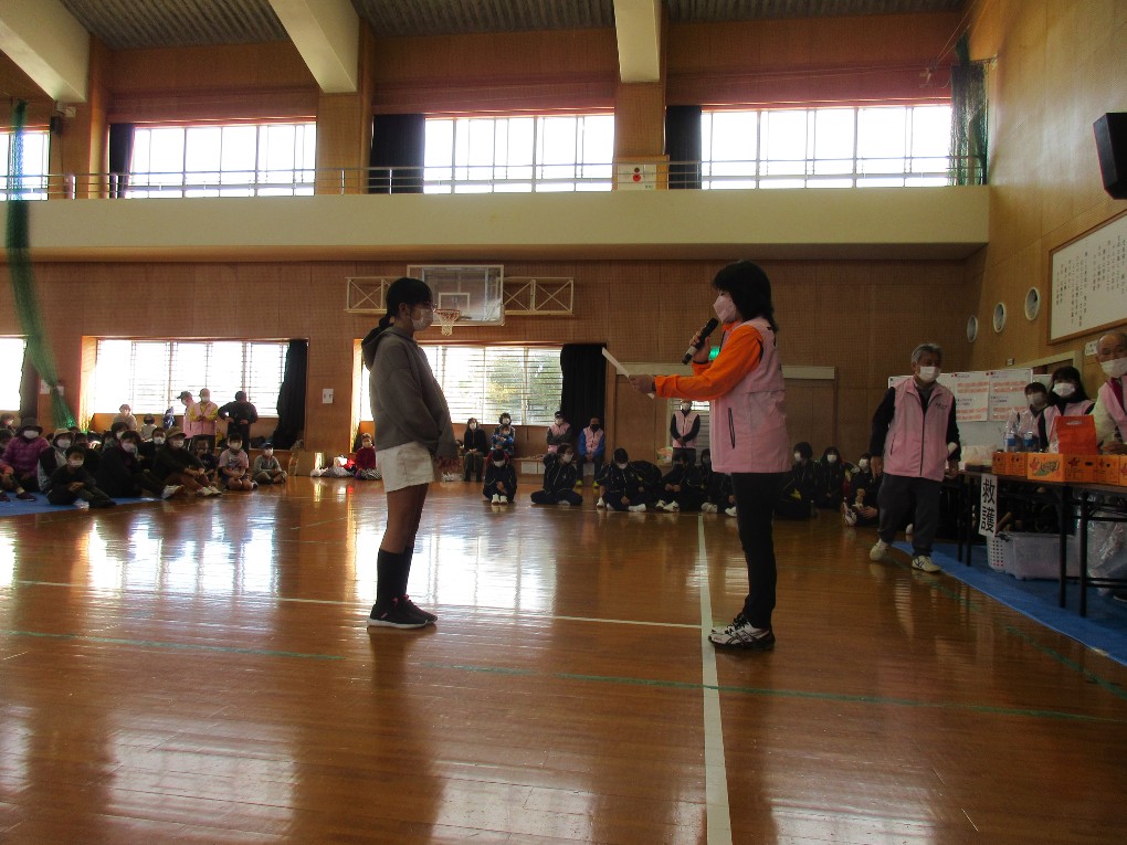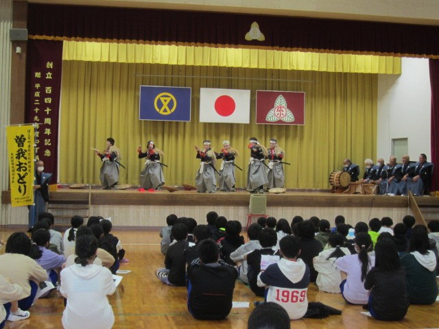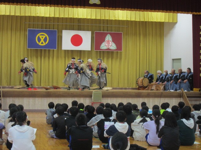 舞踏と演劇が一体化した伝統芸能で、建久4年(1193年)父の仇、工藤祐経を討った曽我兄弟の義拳をたたえたもので、保存会の皆さんが凛々しい若武者に扮して演じてもらいました。子供たちは保存会の皆さんがばっちょ傘をかぶり、みのをまとって腰に日本刀を身につけた衣装に、目を丸くして見入っていました。