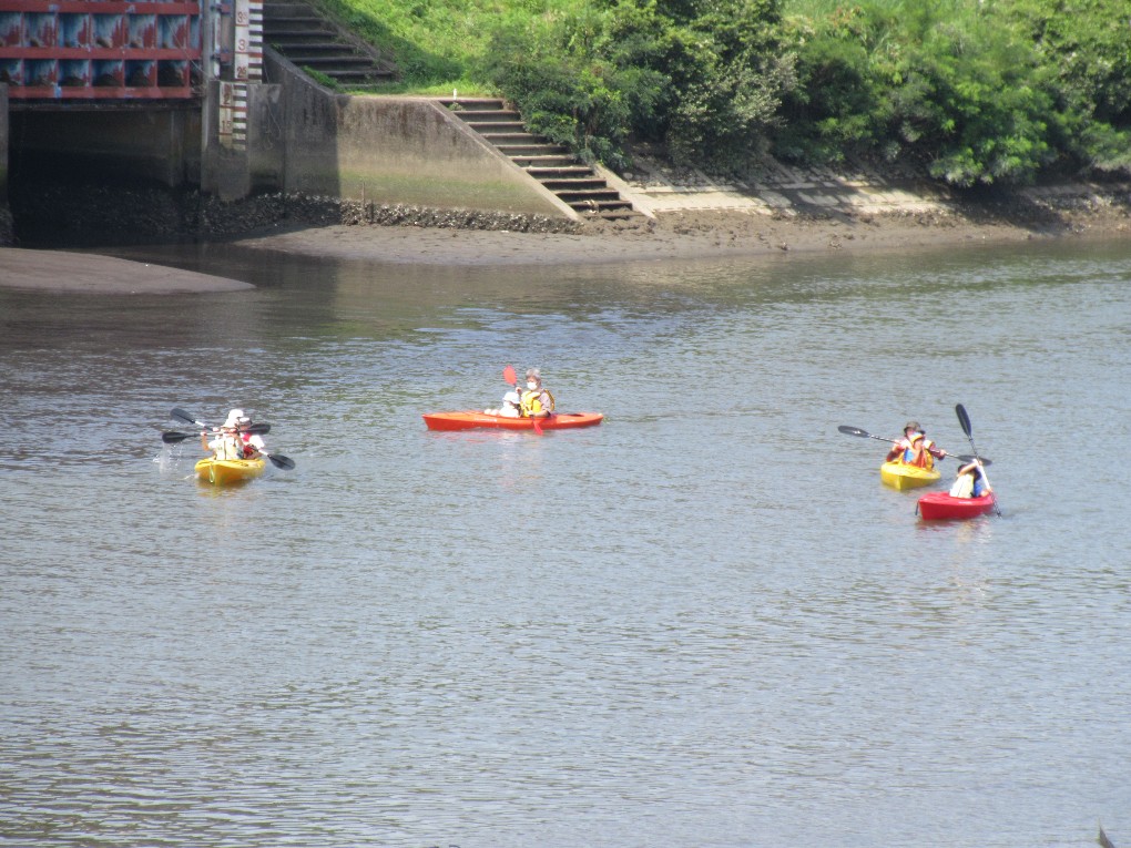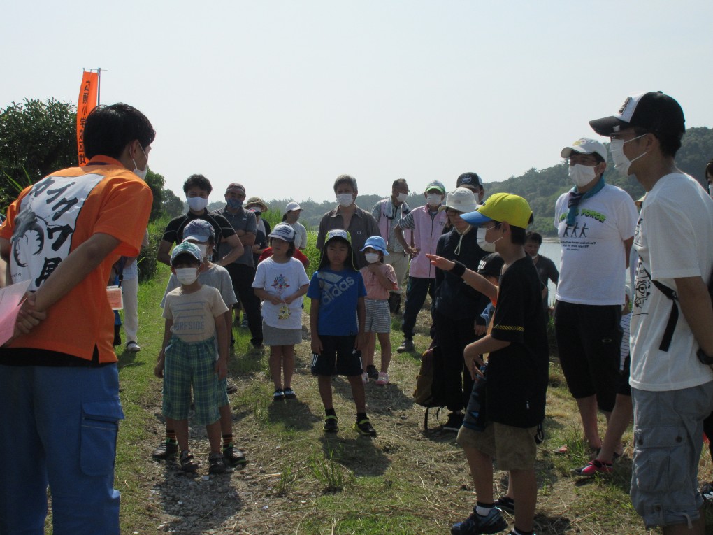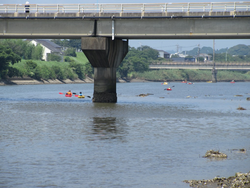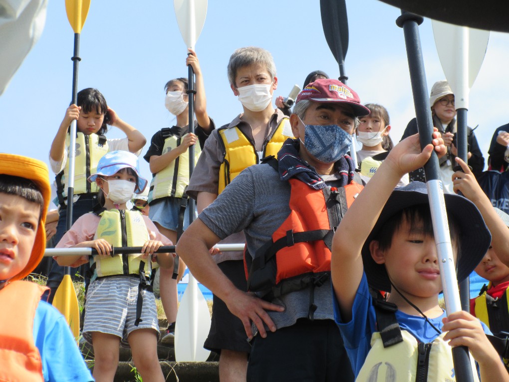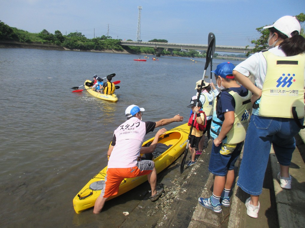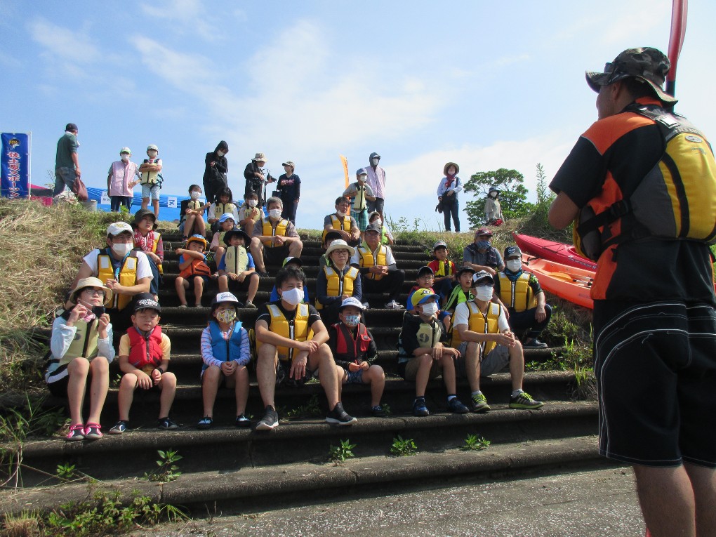 朝から真夏の太陽が照り付ける中、佐土原町広瀬を流れる石崎川でカヌー教室を開催しました。当日は小学生27名、保護者20名、スタッフ18名、中学生のボランティア2名等総勢67名が参加しました。当日は開会式の後、大淀川学習館の濱田氏による石崎川の魚についての講話を聴いた後、半九レインボースポーツクラブの澤山氏より、カヌーの乗り方やパドルの使い方の説明と佐土原スポーツクラブの井上氏によるカヌーの漕ぎ方の実演を見て、親子が13艇のカヌーに次々乗り込みました。しかしこの日は大潮の干潮と重なり川の水位が下がってカヌーが川底につき、スタッフが川に入り悪戦苦闘してようやくカヌーを送り出すことが出来ました。