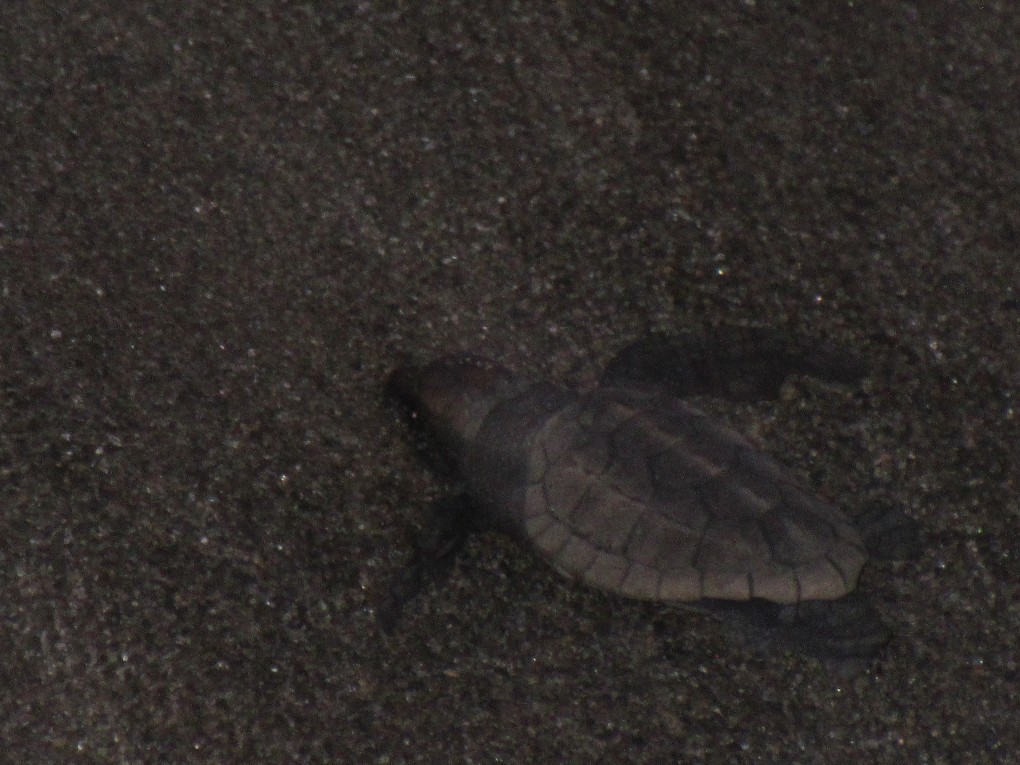 8月9日に子ガメ観察会を開催しました。観察会には親子連れ48名、スタッフ14名が参加し、太平洋に朝日が昇る中感動の自然の営みを幸運にも目にすることが出来ました。アカウミガメを守る会の野生動物研究会会員である鹿嶋徹氏によると石崎浜海岸には、今年98頭のカメが上がり,その内67頭が産卵したそうです。今回観察できたのは5月25日に産卵した場所でした。その産卵場所では既に我々が到着する前に子ガメが孵化し海に向かった足跡がたくさん残っていました。我々はその後孵化して出てきた子ガメ7匹をを運よく観察することができ、子どもも、大人も海に向かって歩き出した子ガメを遠巻きにしながら大自然の営みにただただ感動するばかりでした。