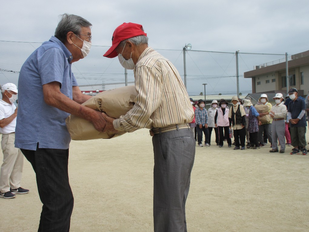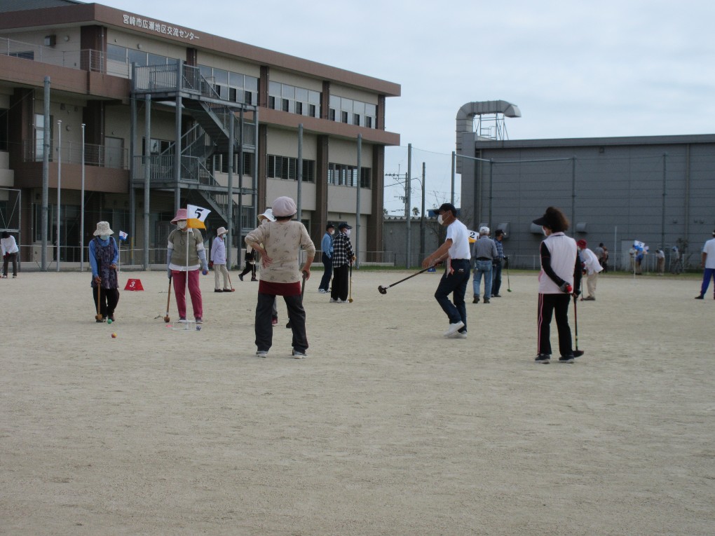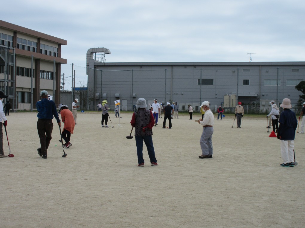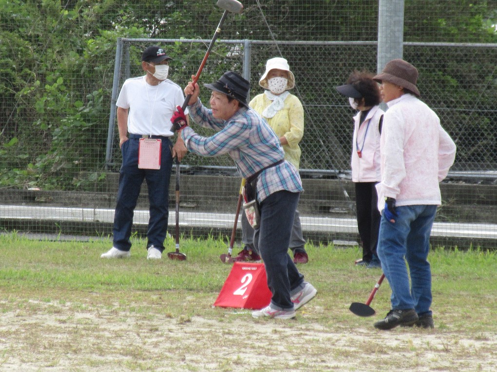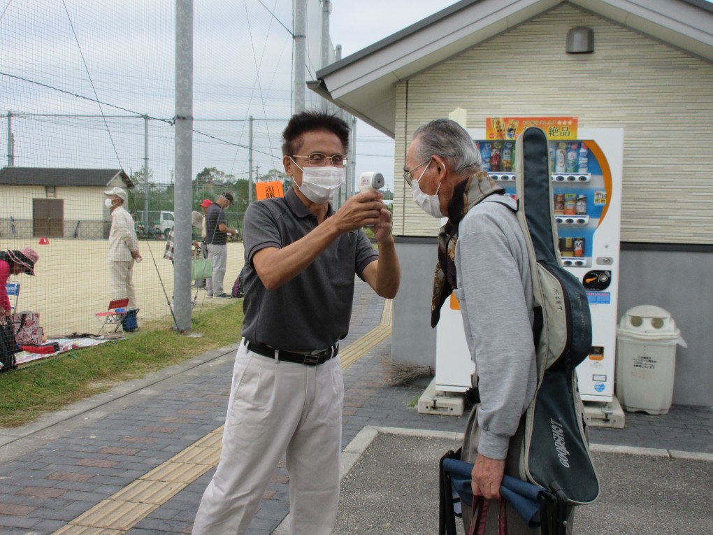 開催までには新型コロナの感染拡大が心配されましたが、9月中旬以降宮崎市では新規感染者が出ておらず、また台風14号の影響も受けずに開催する事が出来ました。今回は新型コロナ対策として、ホールを、2コース12ホールとし、チーム編成も4人制で各自治会2チームまでの参加として人数制限を行い、昨年の約半分の84名の方がプレーを楽しまれました。又グラウンド入口では検温とアルコール消毒などの対策をしました。