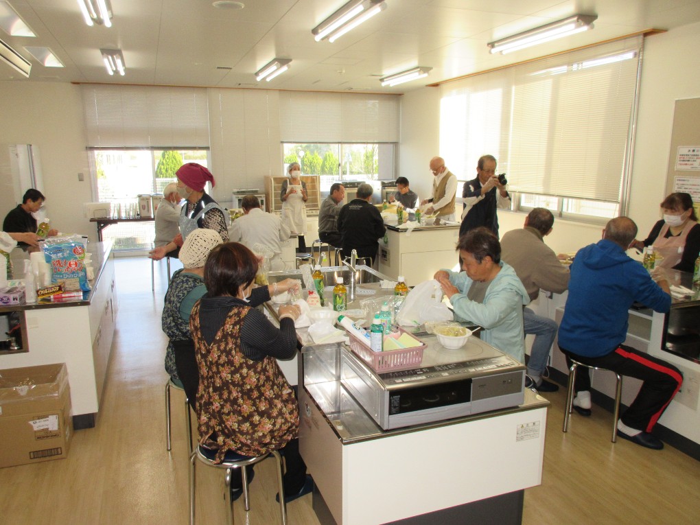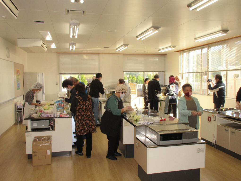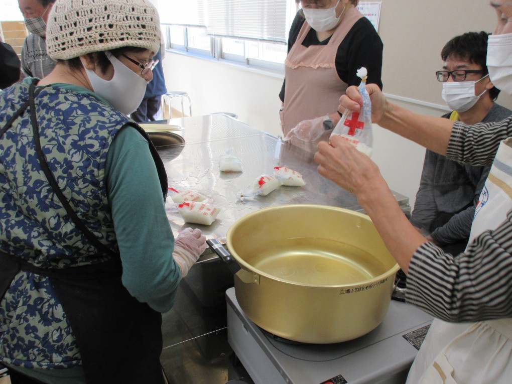 災害時にいろいろな調理器具が無くても、お湯を沸かす鍋とビニール袋で作る簡単な非常食づくりの講習会を開催しました。今回の講習会では日赤の3名の方に指導いただいてサバとキャベツのカレー風味とごはんをつくりました。11号のビニール袋に4人分でキャベツとタマネギ1/4サバ水煮缶1缶とカレーのルーを適量入れ、ビニールの空気を抜き沸かした鍋に入れ約30分煮ればおいしい非常食の出来上がりです。ごはんは今回はハイゼットのビニールを使い同じように鍋に入れ約20分煮て炊き立てごはんの出来上がりです。このビニール使った調理は災害時以外にもキャンプなどで役立ちそうです。