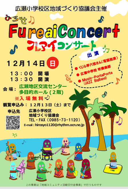 広瀬小学校区地域づくり協議会主催のFureaiConcertを下記日程で開催します。目の前の迫力ある生演奏をお楽しみください。今回はくじら六弦さんの落語独演もありますョ!